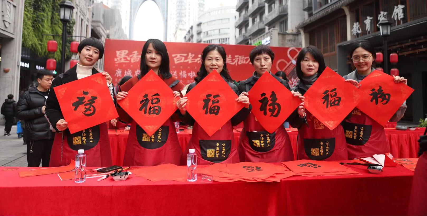 1月13日下午,由工业集团工会参与协办的“墨香温州·2020百名淑女送福进万家”大型活动在禅街八中门口举行,来自集团总部和子公司的7位女书法爱好者与现场一百余名女书友一起同台献技,现场泼墨行书,书写“福”字、春联,为过往的市民送上浓浓的年味和新春祝福。