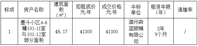 温州市医药实业发展有限公司墨斗小区4-6幢101-11室与101-12室部分面积于2021年1月12日完成公开招租,现将结果公示如下: