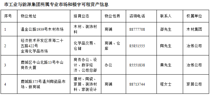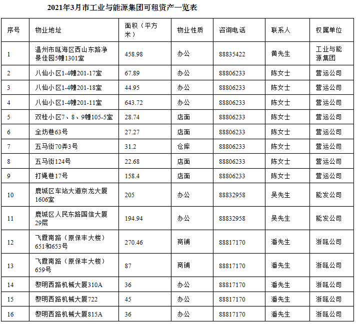 温州市工业与能源发展集团有限公司为市属国有独资有限责任公司,为提高国有资产经营效益,同时让社会各界能充分了解工业与能源集团国有资产招租经营活动信息,根据《温州市市属国有企业国有资产交易监督管理办法》等相关政策的信息披露规定,现将2021年3月拟招租的商业、办公、仓储等房产信息予以预公告,诚挚欢迎社会各界意向人士联系垂询。