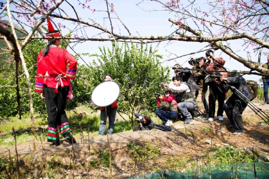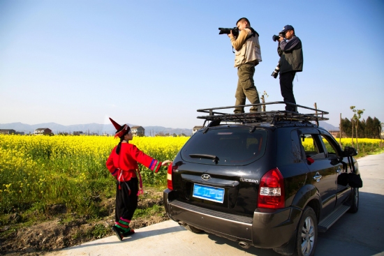 这次摄影俱乐部目的地是灵溪镇溪心村,邀请刘国居老师进行现场指导,会员们面对静物西红柿等的特写把握的很好,再加上农民们在现场劳作并很配合下,使画面有了动态感。在桃花园里,跟随我们的模特换上了鲜红的、民族风味的服装,似乎一边“满树和娇烂漫红,万枝丹彩灼春融”的桃花,另一边“烂漫清雅,娴静脱俗,亭亭玉立”的少女,即相呼相衬,又争红斗艳,好一幅画意美景,让我们的镜头一览无遗。下午又到了一处“满地尽带黄金甲”的高黎村,那是一片油菜花,老师又开始设计场景,一对“小恋人”,在田野小路上奔跑着放风筝,在油菜花中嬉戏着,充满春意、花意又爱意的甜美风情。