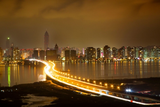 几番交流,几度快门后,似乎还不过瘾,最后决定收揽瓯越大桥。因为只听说有个观景台,却不知道具体位置,此时已经是晚上10点了,但发烧友们还是不放弃去寻找,功夫不负有心人,眼前美景也不负我们的坚持,温州的临江景色,大厦霓虹灯光倒影在江面,瓯越大桥的优美曲线,完美的点线结合,光影效应,一览无遗全单照收。