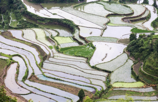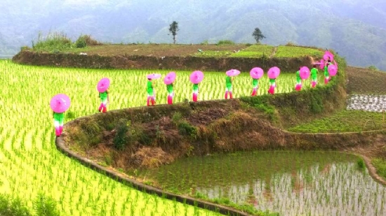 当我们从这场“艳遇”中平静下来的时候,发现满山的浓雾已经不见了,天空中偶尔还透出缕缕阳光。于是我们继续奔波于各个拍摄点,尽管汗流浃背,只希望把眼前这片梯田最美的一面凝固下来。