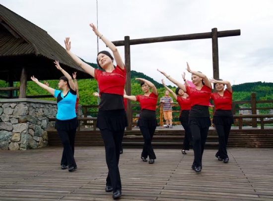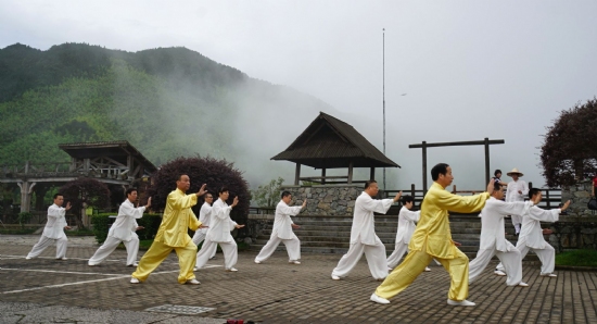 美丽的南尖岩景区,气势磅礴的云海和白云深处的高山梯田,清新的空气,让人心旷神怡。两个俱乐部会员在不同时段分别对太极拳、八段锦、六字诀及中华韵、排舞(桃花源、善柔情韵)等进行了集训和演练。松沉柔顺、圆活畅通的太极,吐故纳新间,一招一式,动静结合,身心合一。轻快的舞曲响起,舞蹈俱乐部会员跟随节奏翩翩起舞,曼妙舞姿婀娜而优雅。阳光斜影穿透云雾而下,为拳舞演绎平添了别一番的韵味。