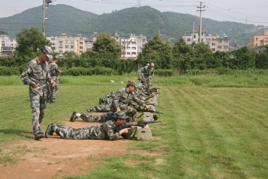 军训分两个阶段。早上为队列训练,下午安排队员赴部队体验实弹射击。队列训练是军训的必备科目,增强意志力,提高个人耐力。队员们头顶烈日,练习站军姿、转体、齐步走、跑步走等队列动作。大家都非常认真刻苦训练,力求做得最好。如学习站军姿,在烈日的照射下,非常整齐地站在滚烫的水泥地上,一个个笔直地站着,抬头、挺胸、收腹,五指并拢紧贴裤缝,豆大的汗珠从脸颊上流下也纹丝不动。教官认真示范动作,仔细讲解动作要领,严格要求队员。虽然只有短短的两个小时时间,经过训练后的队伍从刚开始松散到后来的整齐、规范,取得了一定的成效。