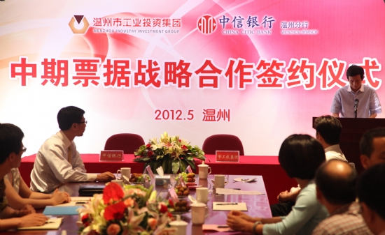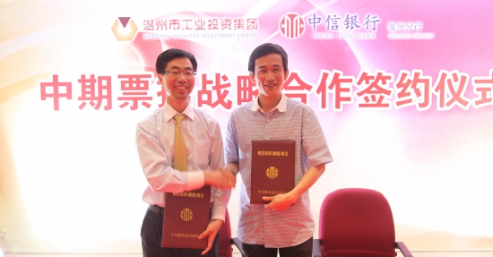 中信银行温州分行行长章定强表示,希望通过此次中期票据业务合作,拓展工业集团在融资渠道选择上的新途径和新思路,提升工业集团在金融市场上的知名度和影响力,为工业集团扩大业务规模、增强竞争实力提供资金支持,为中信银行与工业集团长期开展多元化、多层次的业务合作奠定基础。