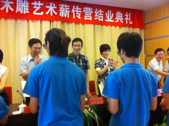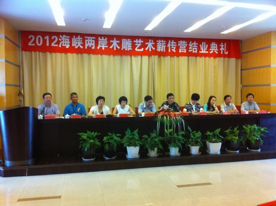 8月28日上午,2012海峡两岸木雕艺术薪传营举行结业典礼仪式,乐清市相关部门领导、集团公司领导和工艺美术大师出席该仪式,乐清市二轻工业总公司总经理包建武主持结业典礼,来自宝岛台湾的十余位学子,在创作营导师虞定良大师的悉心指导下,潜心学习,专心创作,取得了预期的成果,每位学员均完成了2件木雕作品。