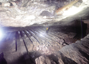 在弯弯曲曲的矿硐里慢慢走,时不时会发现一个个巨大的采空区,是采完矾矿之后留下的,就像一个巨大的舞池,舞池中间会留有用来支撑的石柱。一个个巨大的“舞池”,就这样被弯弯曲曲的矿硐连接着。