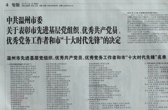 2011年7月1日《温州日报》4版刊登,中共温州市委关于表彰市先进基层党组织、优秀党务工作者和市“十大时代先锋”的决定。我公司党委被中共温州市委评为2010年度市先进基层党组织。