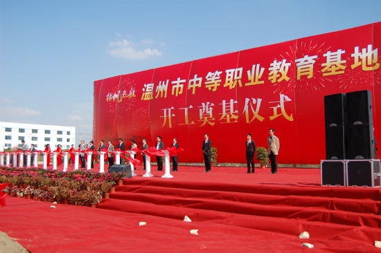 近日,位于滨海园区的市重点项目温州市中职教育基地举行了开工奠基仪式,省、市领导陈德荣、陈金彪、陈笑华、包哲东、葛益平、仇杨钧和工业集团党委书记、董事长周新波等领导出席了仪式,并为基地建设开工奠基和剪彩,市相关部门领导和工业集团部分领导及五所入驻院校师生代表近千人参加仪式。