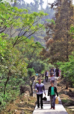 踩着新砌的花岗岩台阶,健身步道在绿色的山林间镶出一道白练。步道宽1.5米多,可两人并肩行走;每一步台阶深40余厘米、高12厘米,女游客踩着高跟鞋照样登山游览。