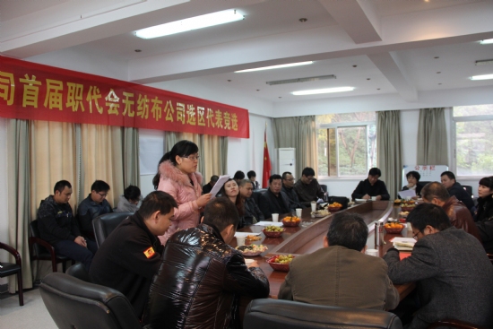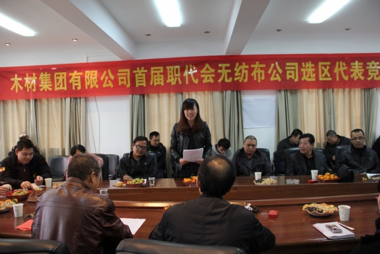 11月30日下午,在公司三楼会议室召开了温州木材集团有限公司第一届职代会新宇无纺布公司选区代表竞选会议。这次代表竞选是我司公司制改造完成后的首次选举,被市工投工会列为试点单位,此次选举得到工投工会的高度重视,工会主席凌虹、副主席陈雷到场监督,有色冶炼、矾矿、面粉、新能源、宏业、机电技师学院、医药商业、二轻供销等八家兄弟单位工会主席到场观摩。我集团工会主席全国荣、副主席冯筱苏、新宇无纺布公司经理卢伟新以及该公司职工和代表候选人等45人参加了会议。