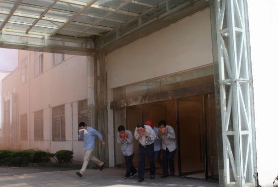演习正式开始后,只见燃机公司综合办公楼二楼突然冒出浓浓的黑烟,滚滚升腾的浓烟顷刻间笼罩住了办公楼。正在上班的职工们听到警报后,由几名专门负责疏散的人员对各楼人员进行指挥,立即从各安全通道撤离,并用湿毛巾捂住口鼻以低姿态迅速、有序地撤离办公楼。到达公司疏散集中地。在整个疏散过程中,仅仅数分钟全体职工便到达安全地带。经过各部门清点人数,所有职工全部安全疏散,火灾逃生疏散演练圆满完成。