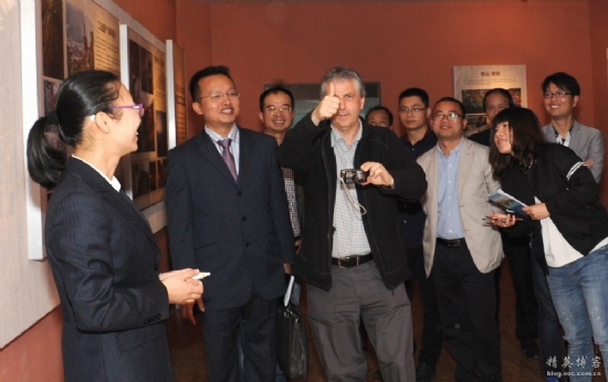4月28日,英国伯明翰大学国际铁桥文化遗产研究院院长迈克·罗宾森(Mike Robinson)一行专程来到矾山考察600多年积淀的矾矿工业遗产。他们先后参观了钟潭、矾矿博物馆、312平硐、炼矾生产现场、矾都矿石馆和奇石馆等景点,参观后欣然题词“This is a wonderful museum and good luck for the future”。虽然一路行程安排的十分紧凑,但迈克先生考察的非常认真,经常询问,对温州矾矿工业遗产项目赞赏有加。