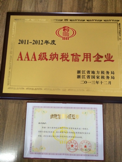 近日,温州矾矿被浙江省国税局、浙江省地税局联合评定为2011-2012年度AAA级纳税信用等级。