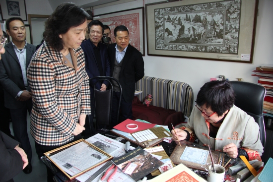王文序一行参观了各大师工作室,并同与非遗传承人认真交谈,详细了解我市非遗的历史沿革、独有特点、文化价值以及传承、创新与发展等,并从非遗文化产品的题材传承与创作、设计的创新与融合、市场的占有与拓展等方面提出了建议。王文序指出,非物质文化遗产的保护与传承,既要秉承传统、不失其本,又要融合一些现代元素,以更好地适应市场,更加广泛地走进现代大众生活。要进一步加强传承人的培训,参加更高层次的学习,提升传承人的现代审美眼光,吸引更多优秀人才加入非遗传承队伍,共同推动文化产业的大繁荣、大发展。(工美院)