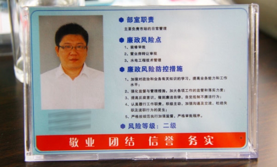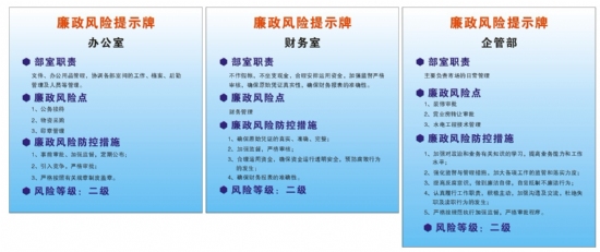 为强化对廉政风险防控的监督管理,每个部门制作廉政风险提示牌,悬挂在部门的墙上,同时将本单位全体工作人员的岗位职责、风险点、防控措施、廉政风险承诺制作成廉政风险监督牌(座牌),摆放在办公桌上,自觉接受监督。陶瓷品市场党支部副书记欧阳南锋多次召开廉政风险防控工作会议,并就本单位抓好廉政风险防控工作做了部署,将此项工作纳入长效机制管理和规范化建设,以此进一步推进公司廉政风险防控建设。