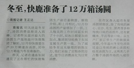 商报讯 明天就是冬至了,汤圆消费逐渐进入高峰。记者昨从温州最大的汤圆生产基地温州快鹿集团了解到,12月份快鹿要生产万箱速冻汤圆,其中12万箱是为冬至准备的。