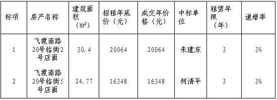 温州市工业与能源发展集团有限公司关于飞霞南路20号临街2号店面、临街5号店面已于2022年2月14日完成公开招租,现将结果公示如下:
