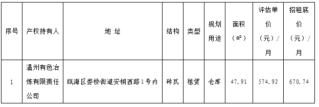 本次招租项目不得用于私人高档会所使用,公告期即日起至2022年3月4日14:00时止,意向承租人须到到鹿城区牛山北路13号牛山商务大厦2521室(温州有色冶炼有限责任公司企管部)办理报名相关手续及缴纳竞价保证金。