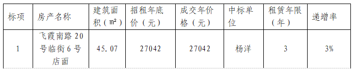 温州市工业与能源发展集团有限公司关于飞霞南路20号临街6号店面已于2022年3月16日完成公开招租,现将结果公示如下:
