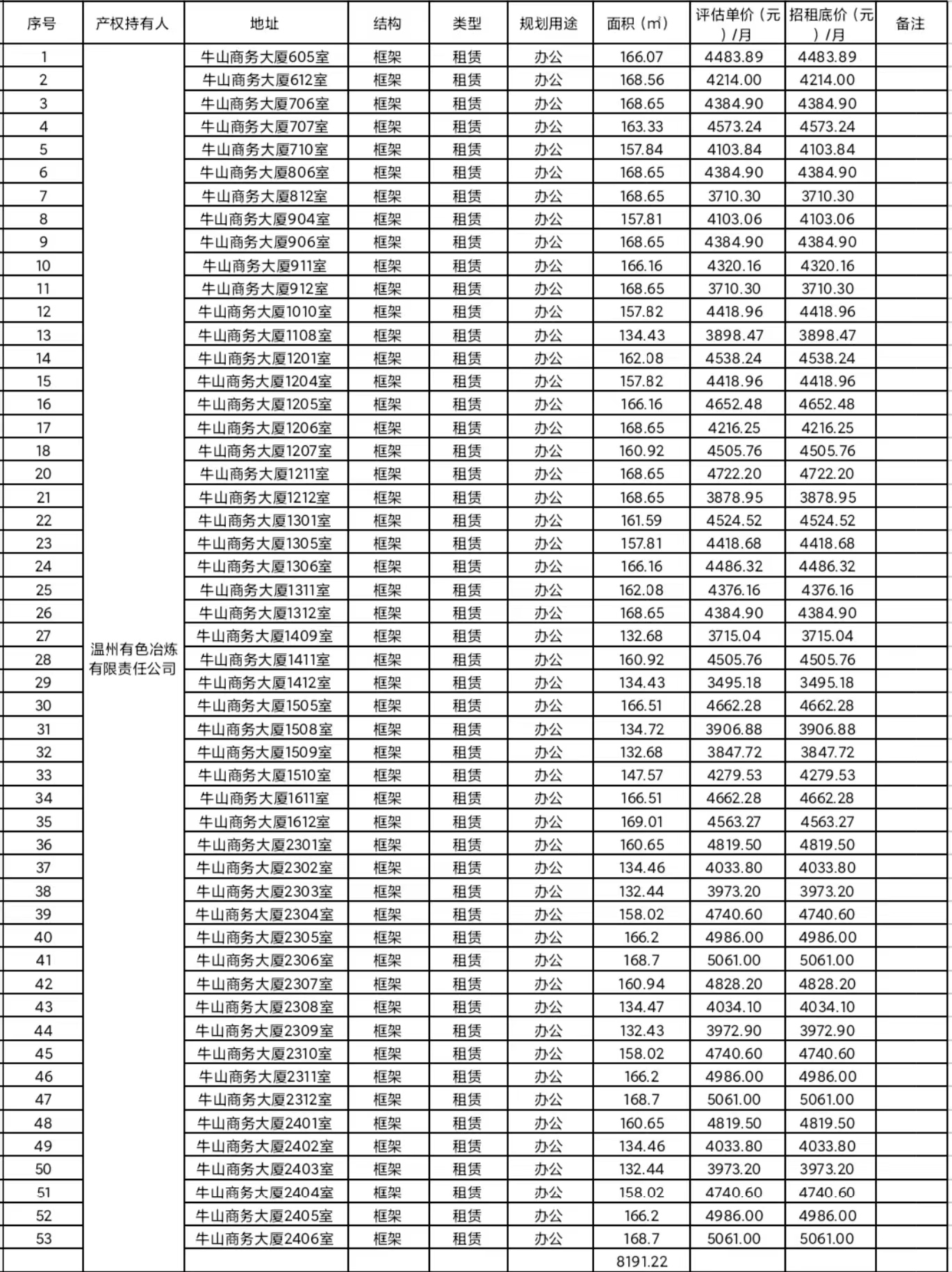 本次招租项目不得用于私人高档会所使用,公告期为公告第二个工作日起至10个工作日止,意向承租人须到到鹿城区牛山北路13号牛山商务大厦2520室(温州有色冶炼有限责任公司企管部)办理报名相关手续及缴纳竞价保证金。