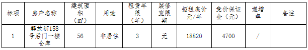 温州市医药实业发展有限公司坐落在温州市鹿城区解放街158号后门一楼仓库房产的年租赁权价值经温州天平房地产估价所有限公司评估,并按相关程序审批,现将招租情况公告如下: