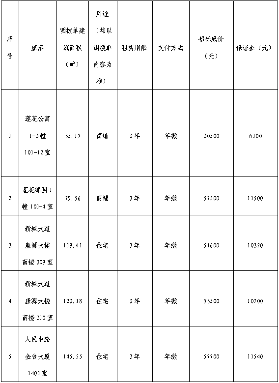 温州市工业与能源发展集团有限公司位于市区市区莲花公寓1-3幢101-12室、莲花锦园1幢101-4室、新城大道康源大楼南楼309室、新城大道康源大楼南楼310室以及人民中路金台大厦1401室,经年租赁权价值评估和相关程序审批,现将招租情况公告如下: