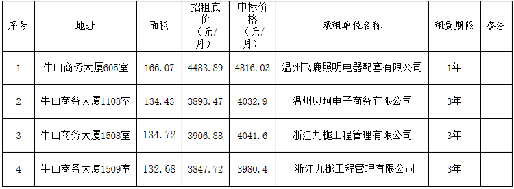 现根据《温州有色冶炼有限责任公司资产租赁管理办法》温冶〔2021〕57号规定,将以上租赁结果予以公示,本公示时间为5个工作日,自公示之日起有关单位和个人对公示事项如有异议,请与温州有色冶炼有限责任公司纪检室反映,联系电话:85551836,联系人:叶先生。