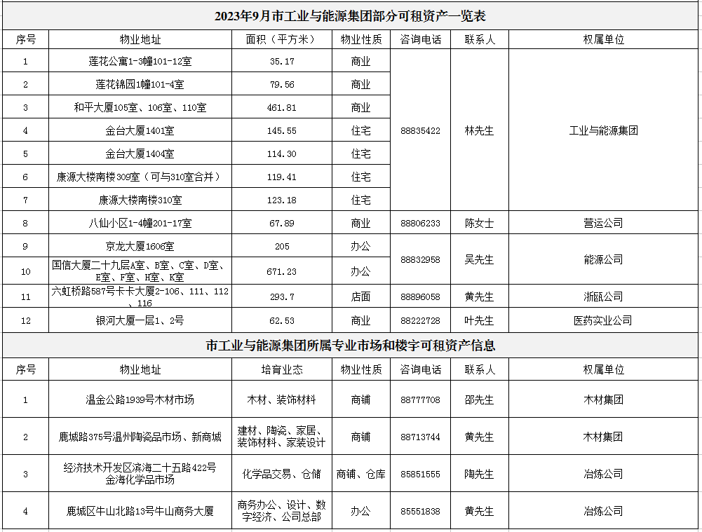 温州市工业与能源发展集团有限公司为市属国有独资有限责任公司,为提高国有资产经营效益,同时让社会各界能充分了解工业与能源集团国有资产招租经营活动信息,根据《温州市市属国有企业国有资产交易监督管理办法》等相关政策的信息披露规定,现将2023年9月拟招租的商业、住宅、办公、仓储等房产信息予以预公告,诚挚欢迎社会各界意向人士联系垂询,咨询时间:工作日9:00-11:30,14:30-17:00。